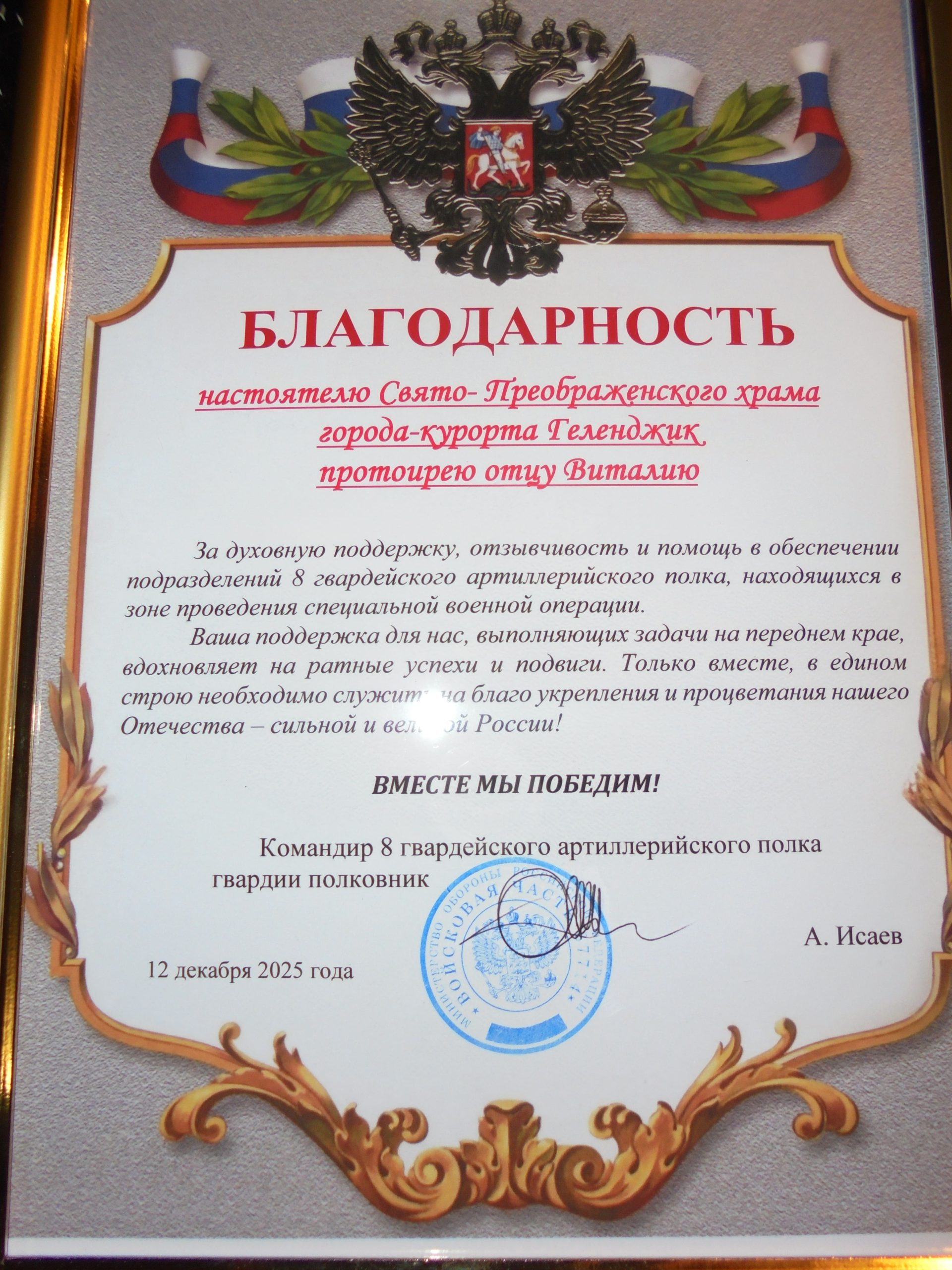 Уходит в историю 2025год, год 80-летия Великой Победы советского народа в Великой Отечественной войне 1941-1945гг. Члены Геленджикской городской общественной организации «Кадетское, суворовско-нахимовское братство» совместно с активом городского Совета Ветеранов активно участвовали в общегородских и краевых мероприятиях в рамках празднования 80-летия Великой Победы. Принимали участие в значимых мероприятиях, проводимых командованием войсковой части 01256 и в Учебном Пограничном Центре Службы в г. Новороссийске Пограничного Управления ФСБ России по Краснодарскому краю. Воины срочной службы посетили Свято-Преображенский храм на Рождество Христово, на Святую Пасху и на Преображение Господне. Офицеры Геленджикского Кадетского братства регулярно проводили «Уроки мужества» в офисе Братства для учащихся школ, колледжей, воинов срочной службы, воинов контрактной службы, групп отдыхающих в летнее время. Так же совместно с ветеранами СВО проводили «Уроки мужества» по школам города-курорта Геленджик. Отправляли гуманитарную помощь в подразделения наших войск в зоне специальной военной операции, участвовали в волонтерском движении. Командование отряда «БАРС-17» и 8-го гвардейского артиллерийского полка прислали «Благодарность» «за помощь в обеспечении подразделений войск, находящихся в зоне специальной военной операции». От руководства МРОО «Братство Ветеранов Боевых Действий» медалями «За помощь СВО» были награждены члены Геленджикского Кадетского братства: адмирал Виктор Федоров, полковник Николай Дуюнов, майор Вадим Кеворков, лейтенант Вячеслав Пирогов и почетный настоятель Свято-Преображенского храма протоиерей Виталий Ковалев. Были подготовлены несколько юношей для поступления в военные ВУЗ-ы. Поздравили юбиляров 2025 года, принимали участие в похоронах наших офицеров и погибших в СВО. Наметили план мероприятий на наступающий 2026 год.