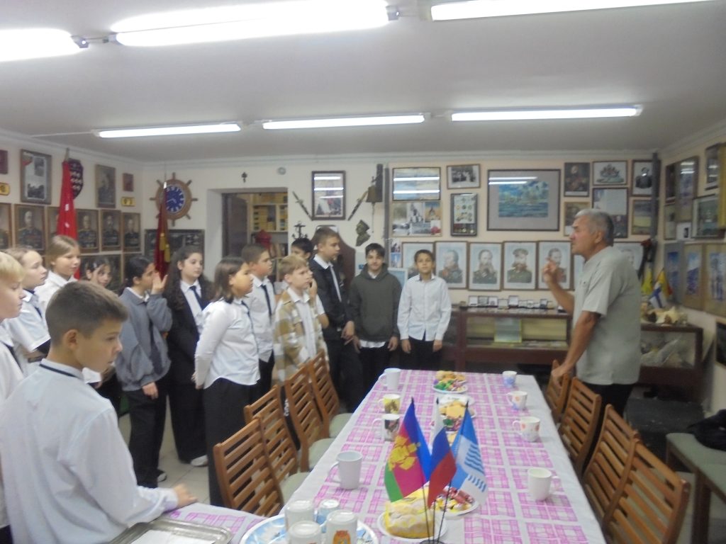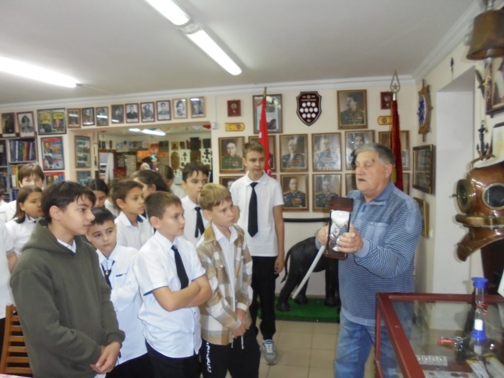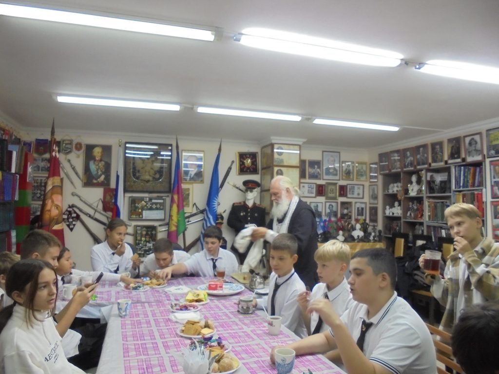 15.10.2025г. В день памяти святого воина Феодора Ушакова адмирала Флота Российского в офисе Геленджикского Кадетского братства был проведен «Урок мужества» для учеников 6-го класса МБОУ СОШ №2 имени Адмирала Ушакова города-курорта Геленджик. С учениками занимались: капитан 2-го ранга Игорь Иванов, подполковник Александр Якшев, ветеран боевых действий майор Вадим Кеворков, старший лейтенант Сергей Игумнов, моряк педагог Жозеф Месропов и почетный настоятель Свято-Преображенского храма протоиерей Виталий Ковалев.