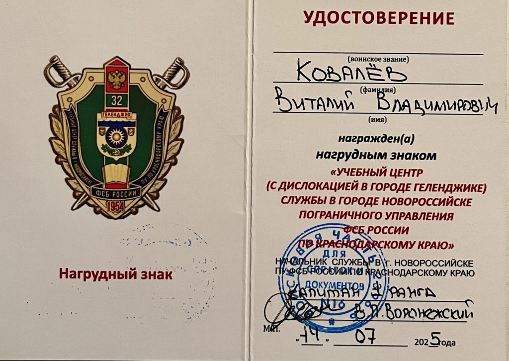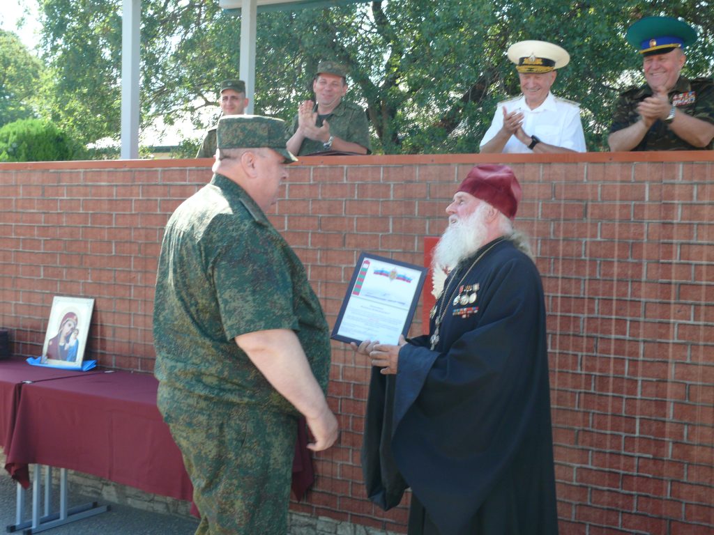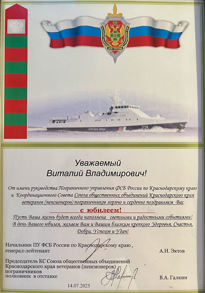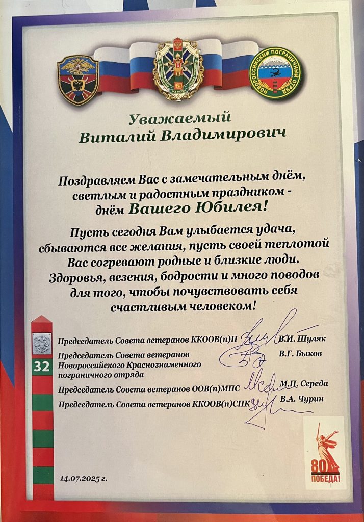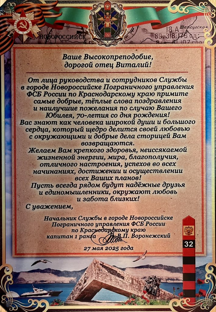 21.07.2025г. На праздник явления иконы Пресвятой Богородицы во граде Казани, в Учебном Пограничном Центре Службы в городе Новороссийске Пограничного Управления ФСБ России по Краснодарскому краю прошел очередной выпуск курсов повышения квалификации. От Геленджикского Кадетского братства воинов-пограничников напутствовали главный инспектор Черноморского Флота адмирал Виктор Федоров и почетный настоятель Свято-Преображенского храма протоиерей Виталий Ковалев. Начальник Пограничного Управления ФСБ России по Краснодарскому краю генерал-лейтенант Александр Эктов поздравил отца Виталия с Днем Казанской иконы Божией Матери, с Днем военного духовенства России, с 70-летием со дня рождения и 30-летием духовного окоромления Учебного Пограничного Центра. Александр Николаевич вручил отцу Виталию Благодарственные письма от руководства Пограничного Управления, от Службы в г. Новороссийске, от ветеранской организации пограничников и вручил Нагрудный знак Учебного Пограничного Центра (с дислокацией в городе Геленджике) Службы в г. Новороссийске Пограничного Управления ФСБ России по Краснодарскому краю.