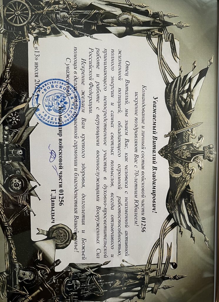 26.07.2025г. В в.ч.01256 прошла церемония принятия новобранцами весна-лето 2025г. военной присяги. Личный состав части с пополнением поздравил и напутствовал новобранцев главный инспектор Черноморского Флота адмирал Виктор Федоров. Благословил воинов-новобранцев почетный настоятель Свято-Преображенского храма протоиерей Виталий Ковалев. Командир части поздравил отца Виталия с 70-летием и поблагодарил за многолетнее духовное обслуживание военнослужащих в.ч.01256.